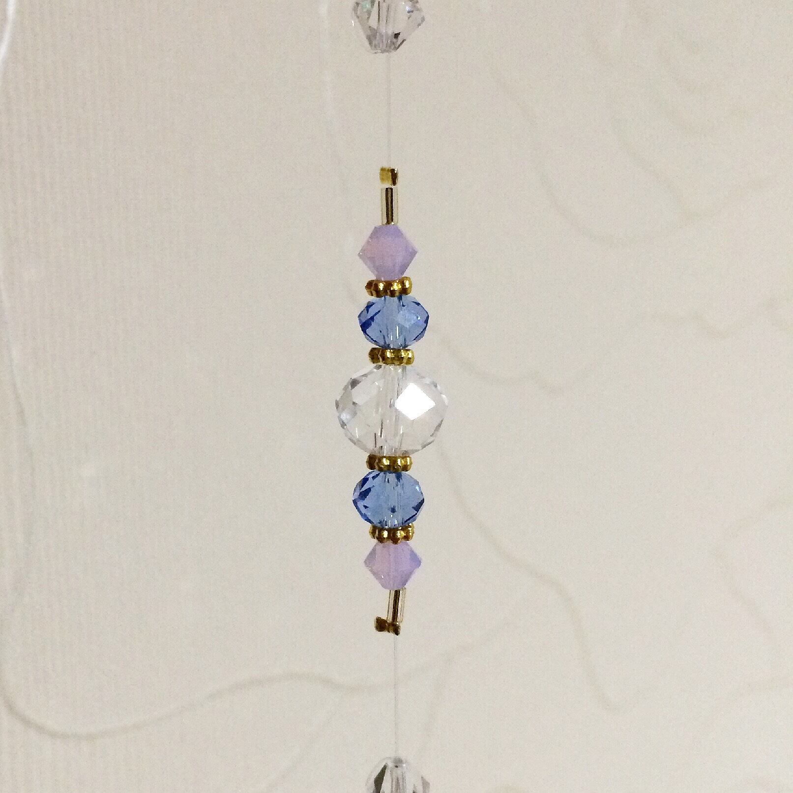 ※サンキャッチャーの一番下のドロップ型ガラス、月のチャームに付いているヘキサゴン型ガラス、その他そろばん型ガラスは、スワロフスキー社製のガラスを使用しております。